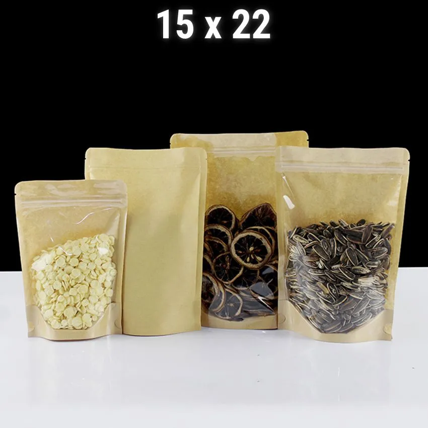 - / Túi zip giấy kraft vàng một mặt kính 15cm x 22cm